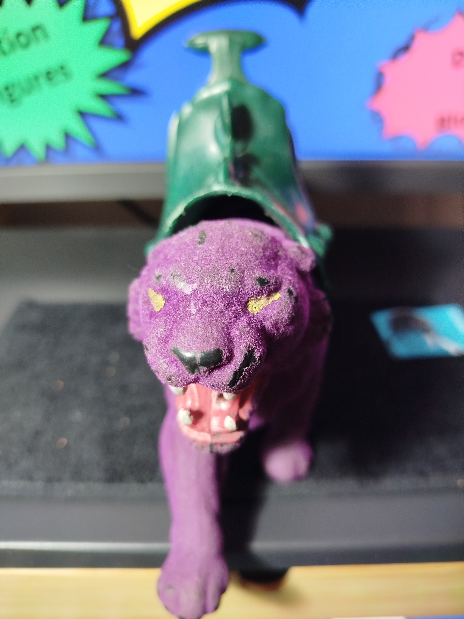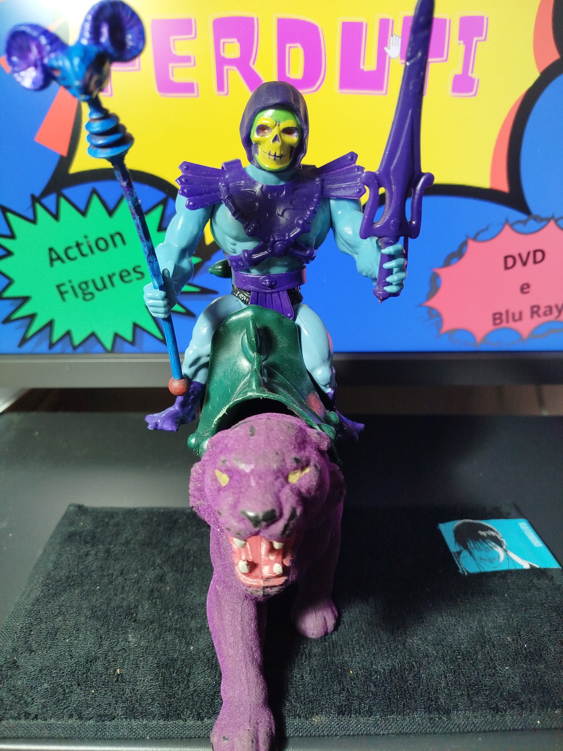 Breve descrizione del prodotto Il set di giocattoli Skeletor e Panthor è un classico della linea Masters of the Universe di Mattel. Skeletor, il malvagio signore di Eternia, è rappresentato con il suo caratteristico aspetto scheletrico, armato di bastone magico e spada. Panthor, il suo fedele destriero, è una pantera viola con una texture floccata che simula la pelliccia, rendendolo unico rispetto ad altri giocattoli della serie. Questo set, introdotto nei primi anni '80, è stato progettato per essere la controparte oscura di He-Man e Battle Cat. Panthor condivide lo stesso stampo di Battle Cat, ma senza l'elmetto e con un'armatura di colore scuro. È un pezzo molto apprezzato dai collezionisti per il suo design e il valore nostalgico